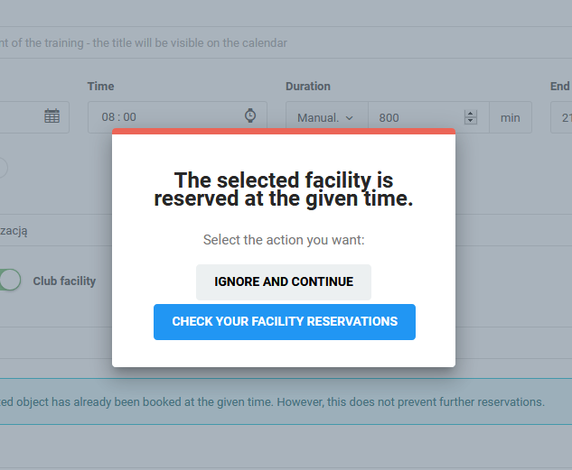 The window that will appear on the screen when you add a training or a match gives you two options: ignoring and creating an event with conflict of terms and the second option: the possibility of checking the facility reservation schedule. This way you will be able to check who is reserving the facility on a given date and, if necessary, make changes to the schedule.