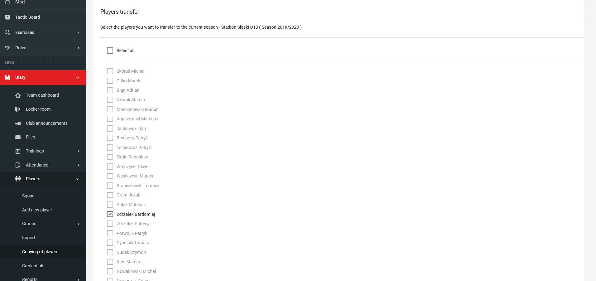 To start copying players from the previous season, please click on the bold text "copy players" as in the picture above or click on the left menu in diary players copying of players.