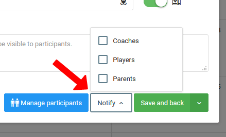 When you create a training session, you have the possibility to set a list of participants (players) and coaches (staff). The selected list of players will match the list of players in the attendance list when checking it. The list of coaches marked as staff member of a particular training session will be shown on the draft. From here you also have the possibility to appoint a player from another team for the planned training. The notification of participants about the training is based on the selection of user groups to which the notification will be sent. It will appear both on the mobile app as well as in the online version of the system.