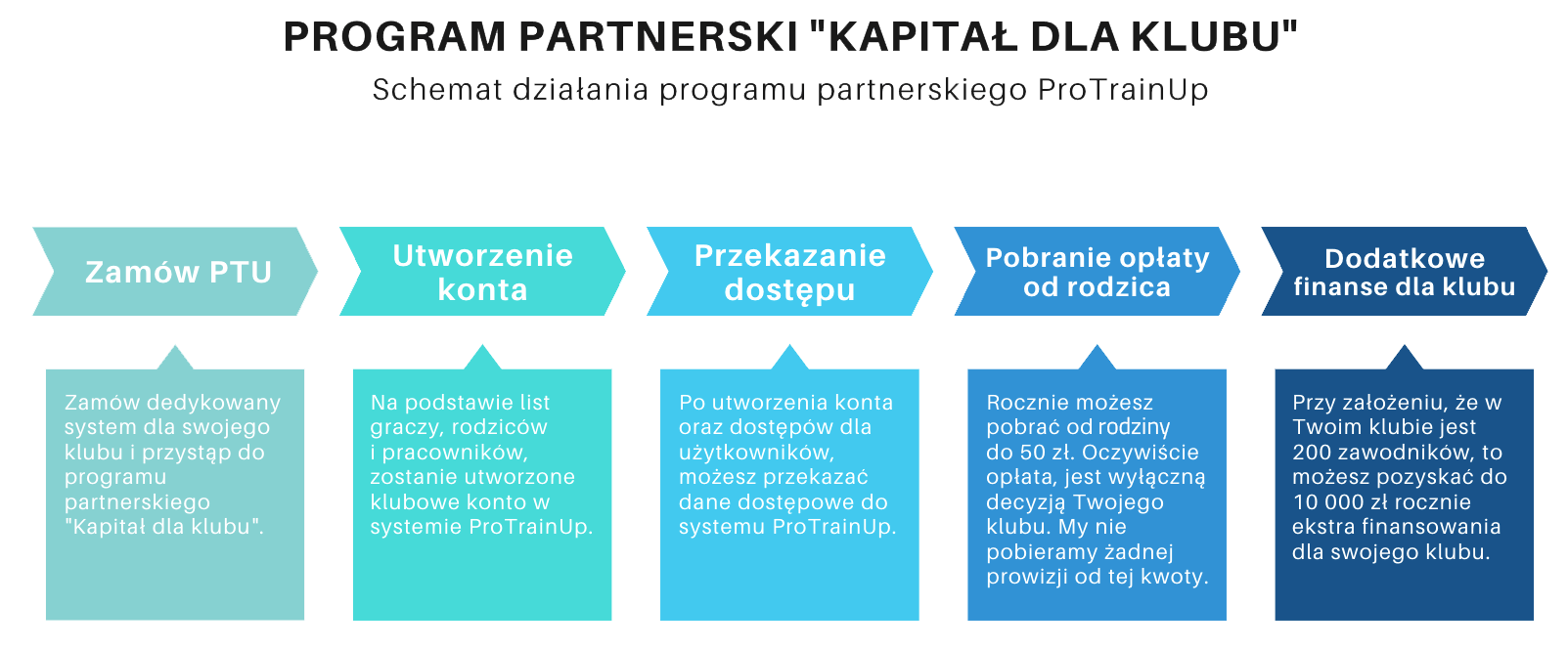 Underfunding youth football clubs is a problem with which the coaches have to face every day. Often sees a situation in which teams must give up the invitations to international tournaments held abroad, due to lack of funds for the trip. Everyday life is also a lack of equipment or lack of uniform clothing players. Affiliate program "Capital for the club" in an initiative aimed at funding clubs and academies, by implementation Club Management System - ProTrainUp.